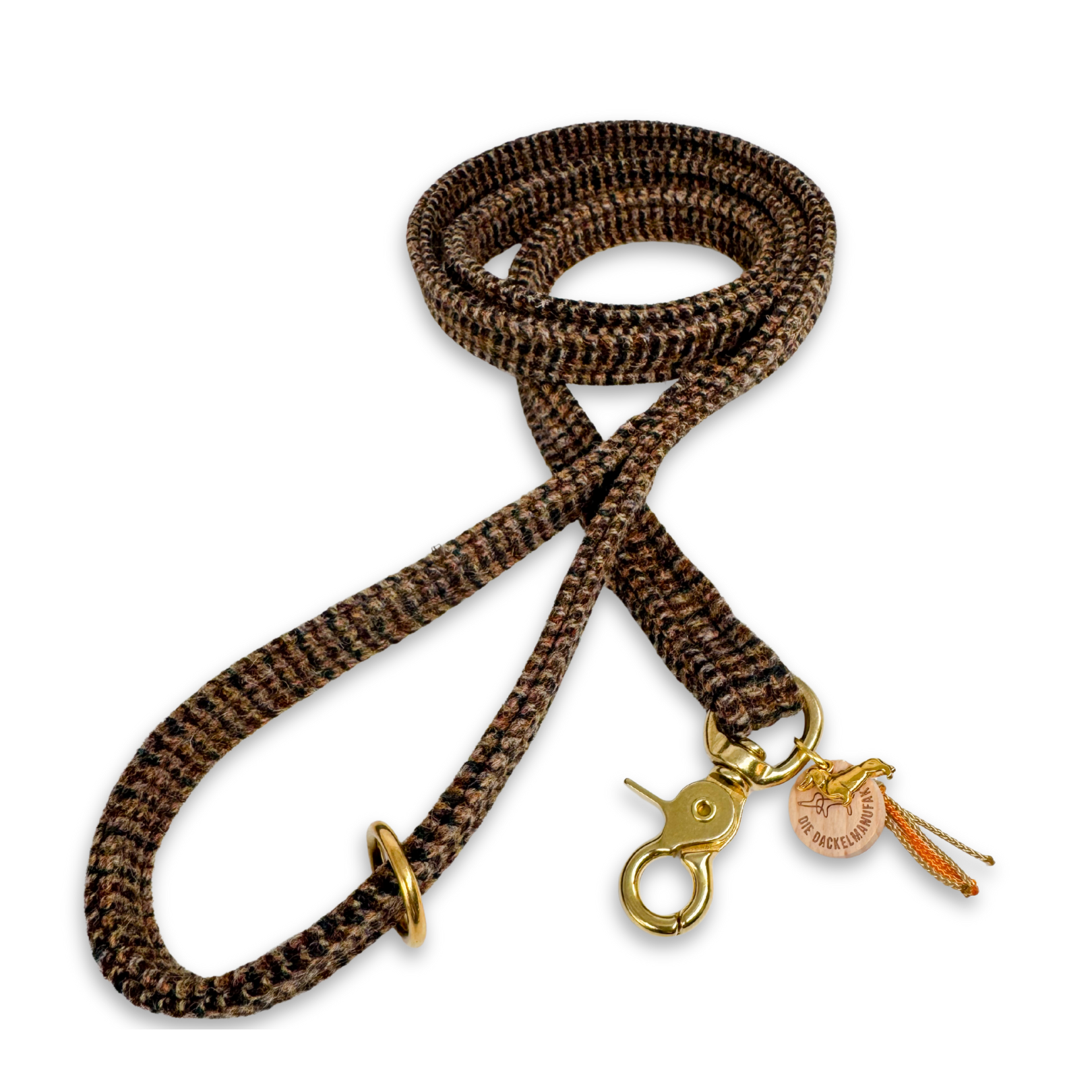 Seine Leine „Baker Street“ ist so britisch wie sein Spürsinn. Klassischer Harris Tweed® in warmem Braun, fein kariert, elegant, aber mit Witz.