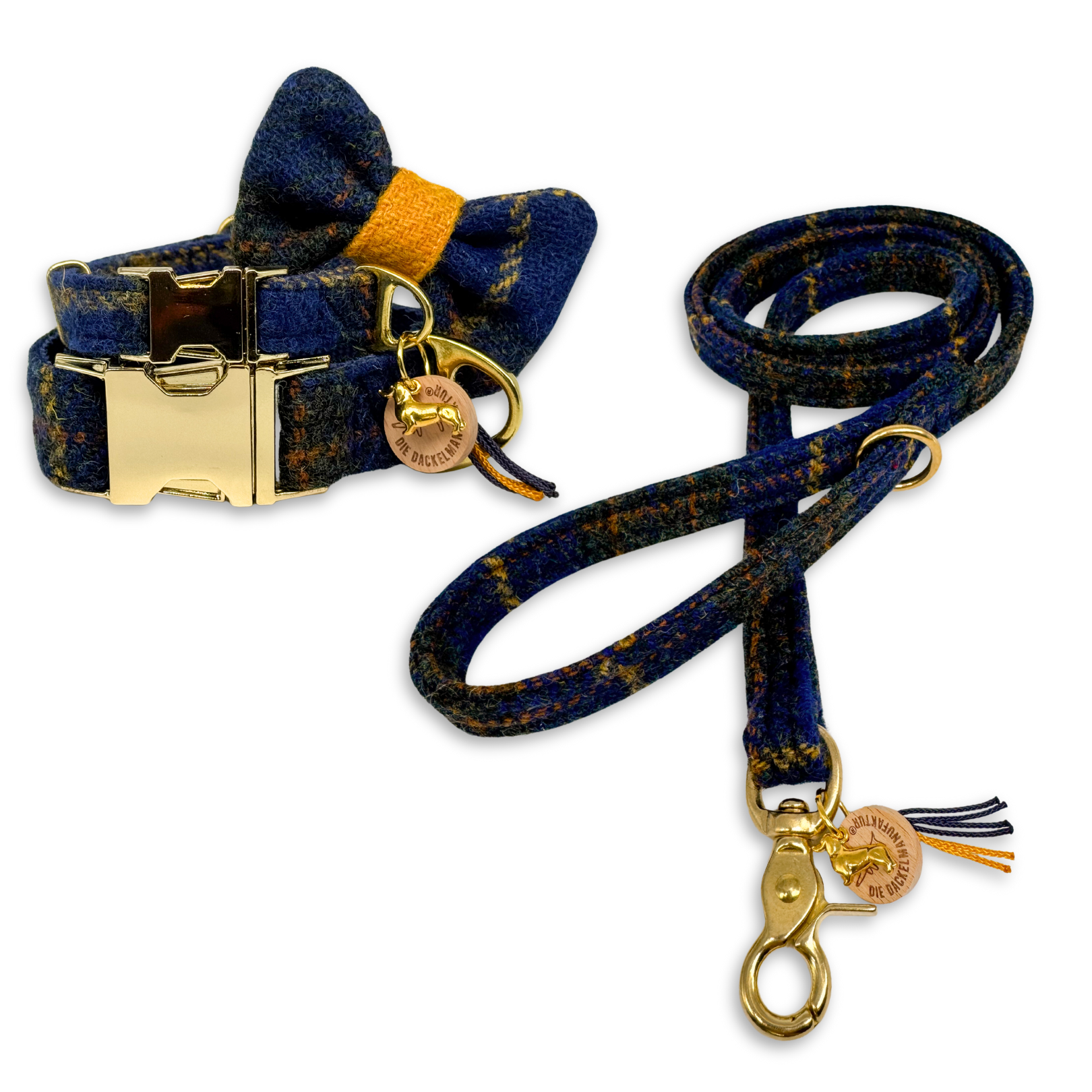 Dunkelblauer Harris Tweed®, durchzogen von feinen Linien in Senfgelb, ruhig, edel und ein wenig stolz. Die Fliege in hellem Gelb mit dunkelblauer Mitte fängt das Licht ein, warm und freundlich, wie der Tag selbst.