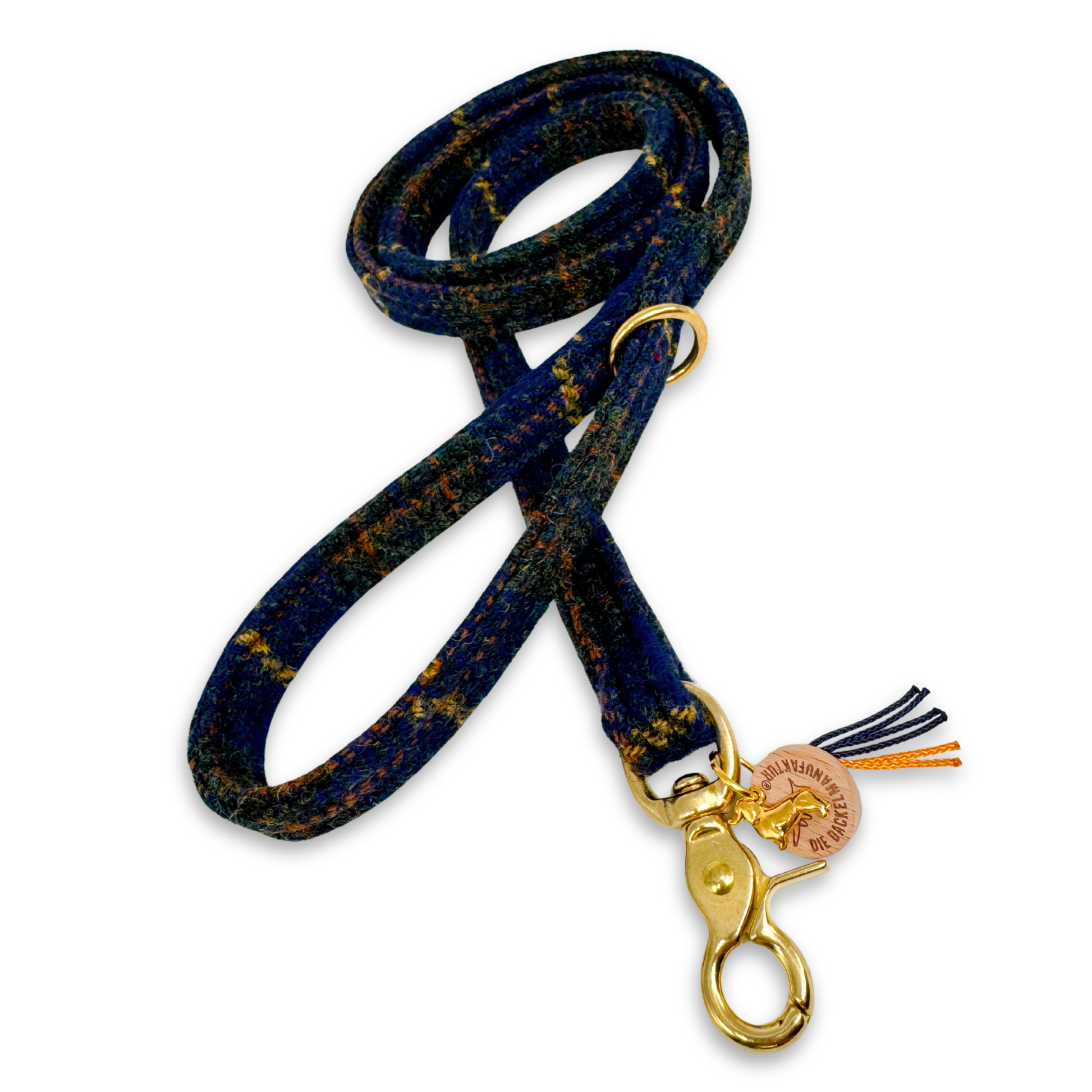Die Harris Tweed® Leine hat eine Länge von ca. 1,30m, kommt mit Handschlaufe und O-Ring. Alle Stressstellen sind mehrfach vernäht. Die Leine wurde mit einem Gurtkern verstärkt, dieser ist nicht sichtbar. Der Scherenkarabiner ist 69mm lang und wiegt 36g und hat eine Bruchlast von 120kg für einen sicheren Halt.